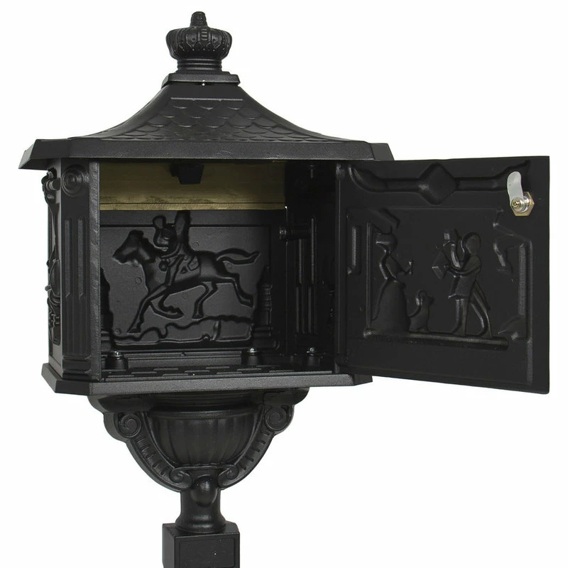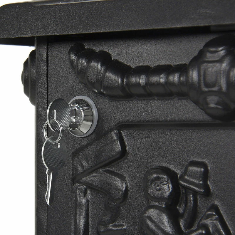 - Features a historic “pony express” design, locking door and an iron mail flap for letters