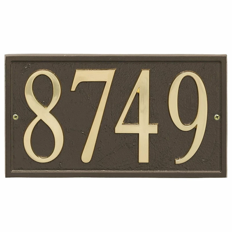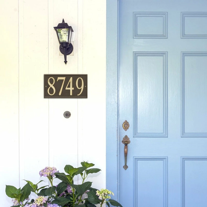- Upgrade your home’s value and curb appeal with this elegant address plaque. Its large, 4.75″ high numbers are easily readable from up to 45 feet away, and it assembles in minutes. Specify up to 4 numerals when ordering and use the included “Design-it” kit cutout templates to get perfect, fail-safe number placement. 4 3/4″ address numbers provide maximum visibility for your street location and are zinc metal-plated to withstand outdoor weather. Super strong, high bond adhesive backer provides a permanent clean finished look. Choice of Silver tone or Gold tone numeral finish. Plaque is available in Black or Bronze-tone and is cast in rust-free aluminum with tough all-weather powder coat finish. Made in the USA. Measures 11.25″ long by 6.25″ high. This product can only be shipped to the continental US.