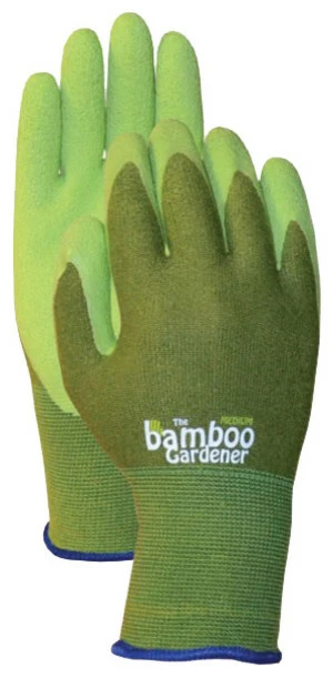 New for the ultimate gardener! These have a seamless knit bamboo rayon liner that keeps the hands cool and comfortable. Natural rubber palm coat protects hands and enhances grip.