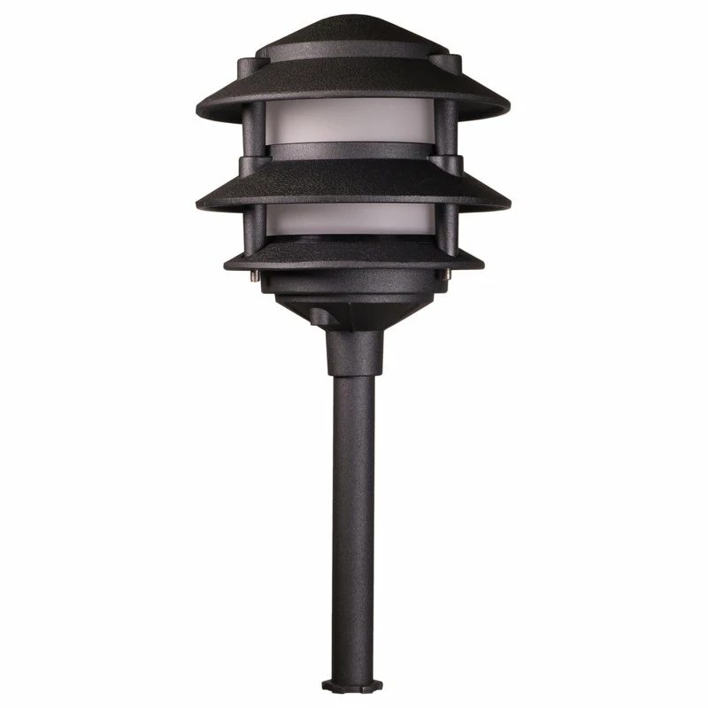 Best Pro Lighting’s contractor grade 3 Tier Pagoda Pathway Light in Powder Coated Black Finish will give a classic and traditional accent to your garden area or pathways. Gives off light in a 360° spread so you can place it centrally in any areas that you would like to be illuminated. With a solid cast aluminum construction in a powder coated finish that is weather resistant. The best applications for these fixtures are: along pathways, low level perimeter lighting, garden bed lighting, area lighting, accent lighting and walkway lighting. These 3 Tier Pagoda Pathway lights feature a frosted glass globe enclosed in a three tiered housing. Includes a Ground Stake. This fixture requires the usage of a Low Voltage (12-Volt) lighting transformer. Wire nuts and connectors are not included.