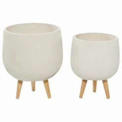 Leverage on the variation in pot size and depth and height of this 2-in-1 set of round indoor planters for contemporary or modern interior designing. The simplicity of the exteriors can match with dim color palettes, muted patterns, and less tactile textures. Wooden stands and no-drainage hole white pots make up the solid construction to not disturb the calmness in a corner of your living space. Planter heights are 15″ and 17″. Use as plant holders or corner accent pieces in modern or contemporary interiors. Wipe clean with a dry cloth. Suitable for indoor and outdoor use Pots do not have drainage holes. These white planters come as a set of two. Contemporary design. This item comes shipped in one carton.