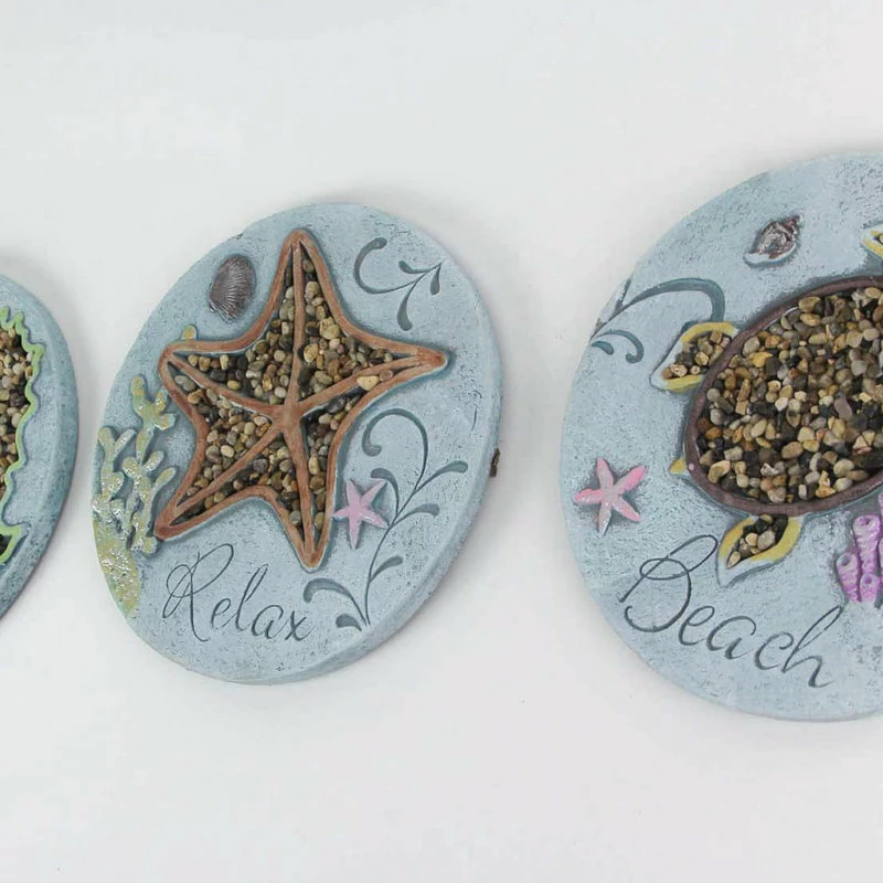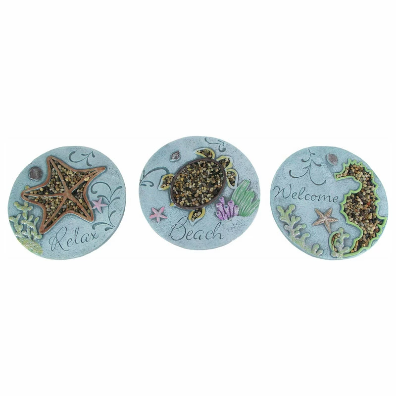 Stepping stones are a great way to add an instant decorative touch to your decor, and this set takes that one step further by giving you the option to hang them on a wall. This 3-piece molded cement step stone set brings a touch of coastal charm and beach character with its light blue painted finish and 3D textured designs of a starfish, seahorse, and sea turtle filled in with pebble stones. Create a path through the yard or garden, use them as a design element in your landscape or display them on a fence or patio wall, and hanging them in the bath or kitchen will draw only the best kind of attention to your home’s interior. This set of 9.75-inch diameter, .75-inch high beach-inspired stepping stones add instant pizzazz anywhere.