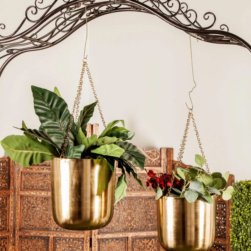 CosmoLiving By Cosmopolitan Large, Round Metallic Gold Metal Hanging Indoor & Outdoor Planters, Set Of 2