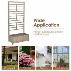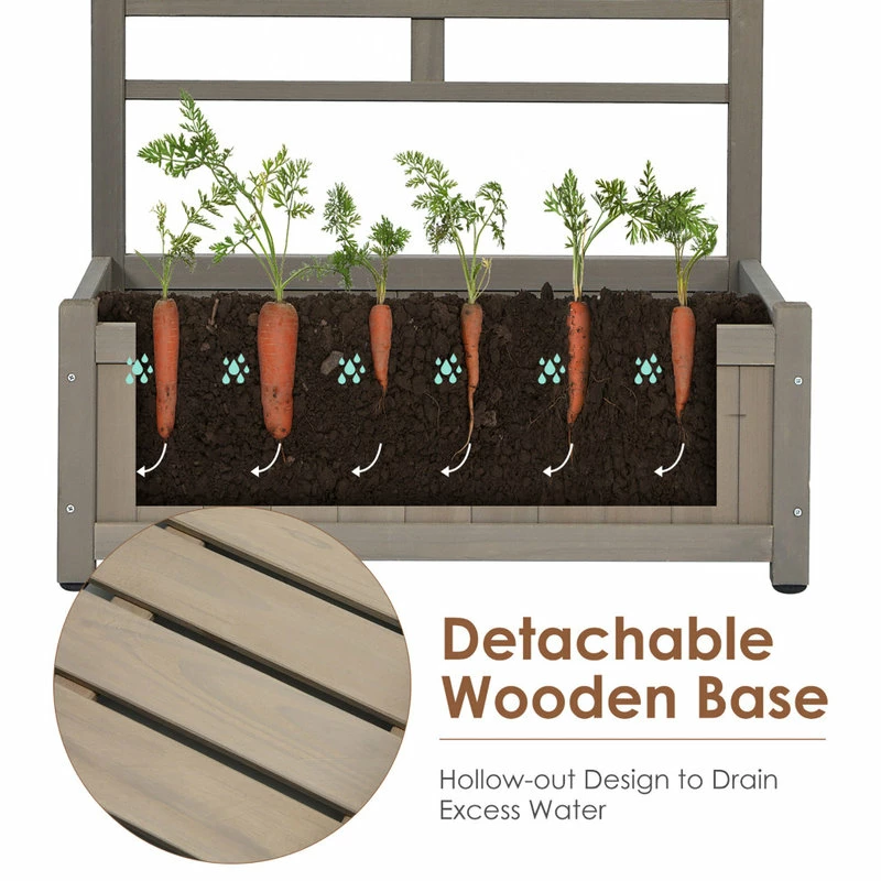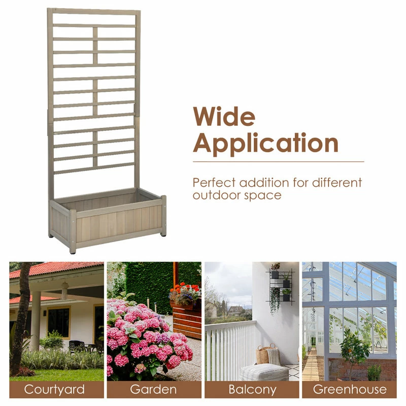 Made of selected fir wood with painted finish, the garden bed has the characteristics of good toughness and deformation-resistant. Large planting area is suitable for cultivating various flowers while the trellis provides sufficient growing space for climbing plants. Designed with removable bottom base, the planter box is beneficial for the roots to go further into the ground. The hollow-out wood slats ensure good air permeability and make it easy to empty excess water. Moreover, the classical style of this planter box matches well with different places, such as garden, backyard, balcony, etc. Just enjoy your garden time with our planter box.