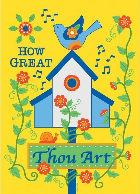 The words “How Great Thou Art” are paired with a colorful garden scene showing a bird, perched on a birdhouse and singing God’s praises, on this vibrant garden flag. Size is 13″ wide x 18″ high. The design is on both the front and back of this double-thickness applique flag. It’s heavier and longer lasting than most flags, using a sturdy weather-resistant polyester. Applique stitching is nicely detailed. (Flagpole not included.) Note: Flag will its retain color and beauty for years if displayed in shade or semi-shade, and is rainproof.