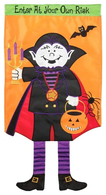 Dracula Trick or Treat ‘ Enter At Your Own Risk’ Crazy Legs outdoor garden flag. Leg dangles add extra fun to the whimsical characters on these seasonal garden flags. Dangles are about 6″ long, appear the same on both sides and move with every breeze! The designs come to life in vivid colors. Our double sided applique flags are double the thickness and readable on both sides. They are heavier than most flags on the market and will hold up longer. They have detailed stitching and a conbination of appliqueed fabric and embroidery stitch. All of our flags are weather-resistant and feature a UV protective coating that is manufactured into the fabric. To extend the life of your flag, place them in the shade or semi-shade and your flag can last for years.