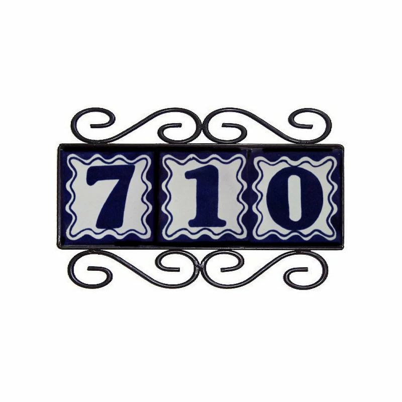 A wrought iron frame made by Mexican craftsmen. It will hold either three bouquet tile numbers or three blue tile numbers. The internal dimensions where the tiles sit are 12 13/16 x 4 5/16″. This is a simple handmade artistic frame, but carefully designed to enhance your house tile numbers. It was designed to be hung horizontally, but if you prefer it vertically, it can be hold using two nails instead of just one.The house numbers frame has wrought-iron-made decorations in the upper and lower parts of the rectangle, they are about 2.2″ tall, which adds to the overall frame vertical size (width).House Numbers Frames Installation SuggestionsHorizontal installation: If you want to install your house tile numbers frame horizontally you can use one or two nails. In using one, the frame might not balance horizontally very well, to achieve a better result use two nails, one on each one of the decorations to hold the frame.Vertical Installation: You will need two nails to hold the frame, nail them to the wall 6.5″ apart from each other and hang the frame from the decorations.”