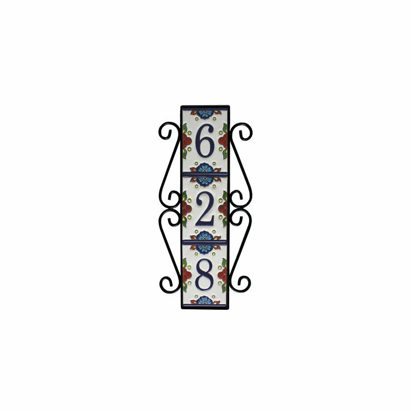 A wrought iron frame made by Mexican craftsmen. It will hold three Mission tile numbers. This is a simple handmade artistic frame, but carefully designed to enhance your house tile numbers. It was designed to be hung vertically. The inside dimensions are: 4 wide by 18″ tall.The house numbers frame has wrought-iron-made decorations in the left and right parts of the rectangle, they are about 2.2″ wide, which adds to the overall frame horizontal size (width).House Numbers Frames Installation SuggestionsVertical installation: If you want to install your house tile numbers frame vertically you need to use two nails, one on each side of the frame, where the scrolls join each other.”