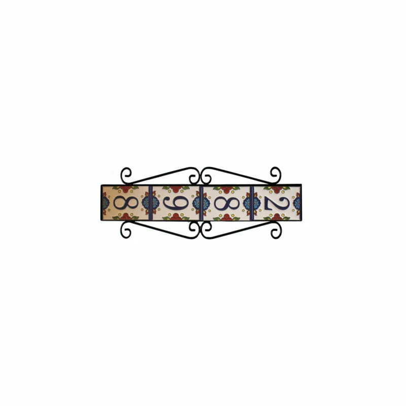 A wrought iron frame made by Mexican craftsmen. It will hold four Mission tile numbers. This is a simple handmade artistic frame, but carefully designed to enhance your house tile numbers. It was designed to be hung vertically. The inside dimensions are: 4 wide by 24″ tall.The house numbers frame has wrought-iron-made decorations in the left and right parts of the rectangle, they are about 2.2″ wide, which adds to the overall frame horizontal size (width).House Numbers Frames Installation SuggestionsVertical installation: If you want to install your house tile numbers frame vertically you need to use two nails, one on each side of the frame, where the scrolls join each other.”