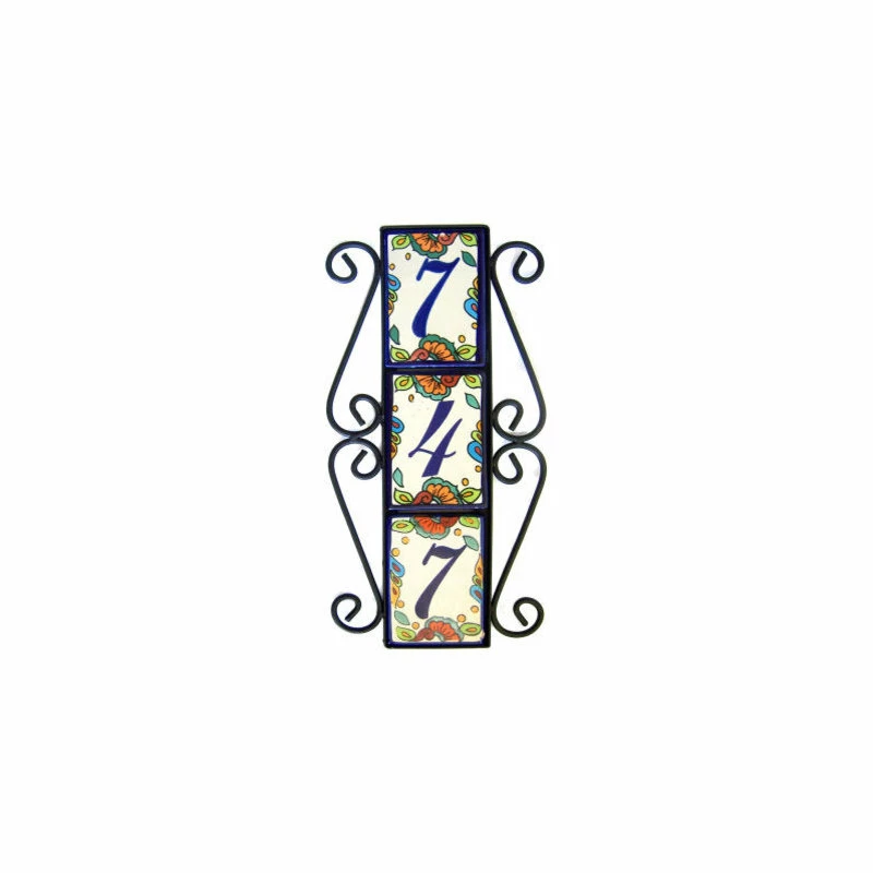 A vertical wrought iron frame made by Mexican craftsmen. It will hold three hacienda tile number. This is a simple handmade artistic frame, but carefully designed to enhance your house tile numbers. It was designed to be hung vertically.The house numbers frame has wrought-iron-made decorations in the left and right parts of the rectangle, they are about 2.2 wide, which adds to the overal frame horizontal size (width). The shown dimensions are overall, the inside ones are: 17″x4.125″.House Numbers Frames Installation SuggestionsHorizontal installation: If you want to install your house tile numbers frame horizontally you can use one or two nails. In using one, the frame might not balance horizontally very well, to achieve a better result use two nails, one on each one of the decorations to hold the frame.”