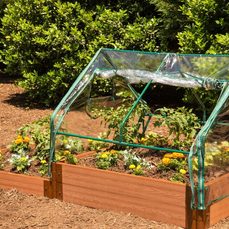 The Frame It All Extendable Cold Frame Greenhouse measures 4ft. x 4ft. and stands 36in. high at its peak. Multiple units can be zippered together end-to-end, to create a continuous row of coverage. The zippered windows allow easy access for tending to your plants, and controlling temperature and humidity. The powder-coated steel frame will not rust or corrode, and the heavy-duty PVC cover will stand up to heavy wind or inclement weather. Connects directly to any Frame It All raised garden bed. When used in conjunction with Frame It All Raised Beds you can increase your soil temperature even further. Our open-channel raised garden bed boards insulate the soil against temperature loss (protecting the roots), while the cold-frame helps control the ambient temperature around the plants (protecting foliage).