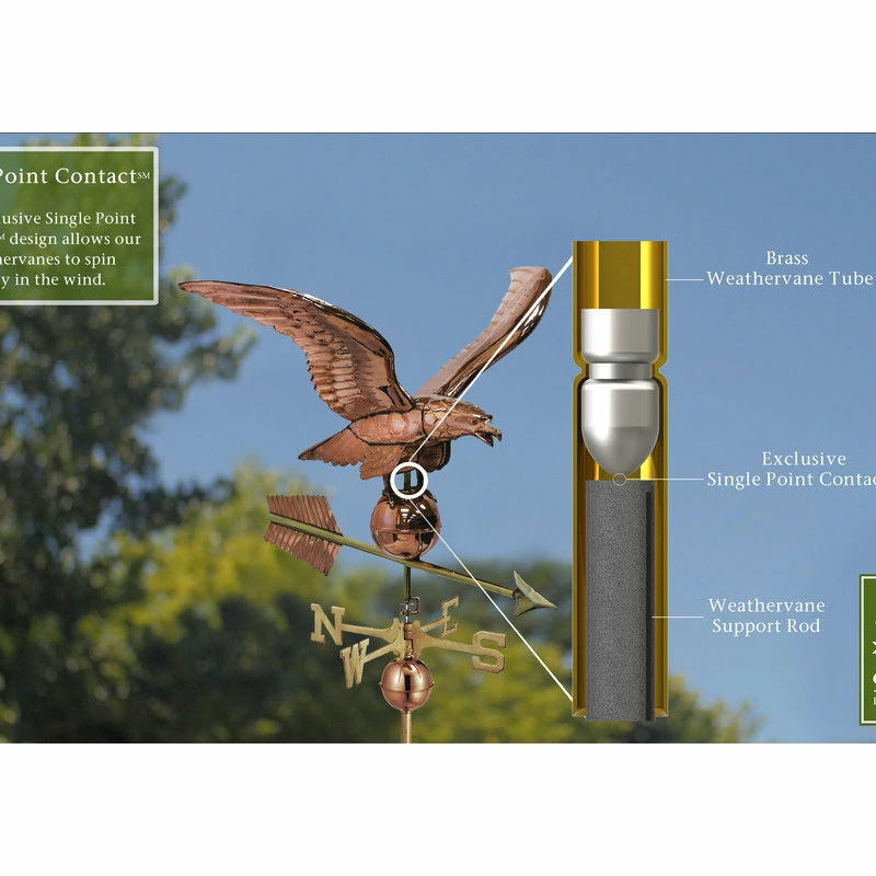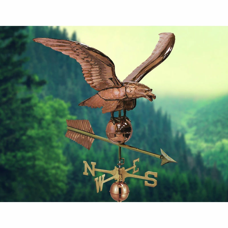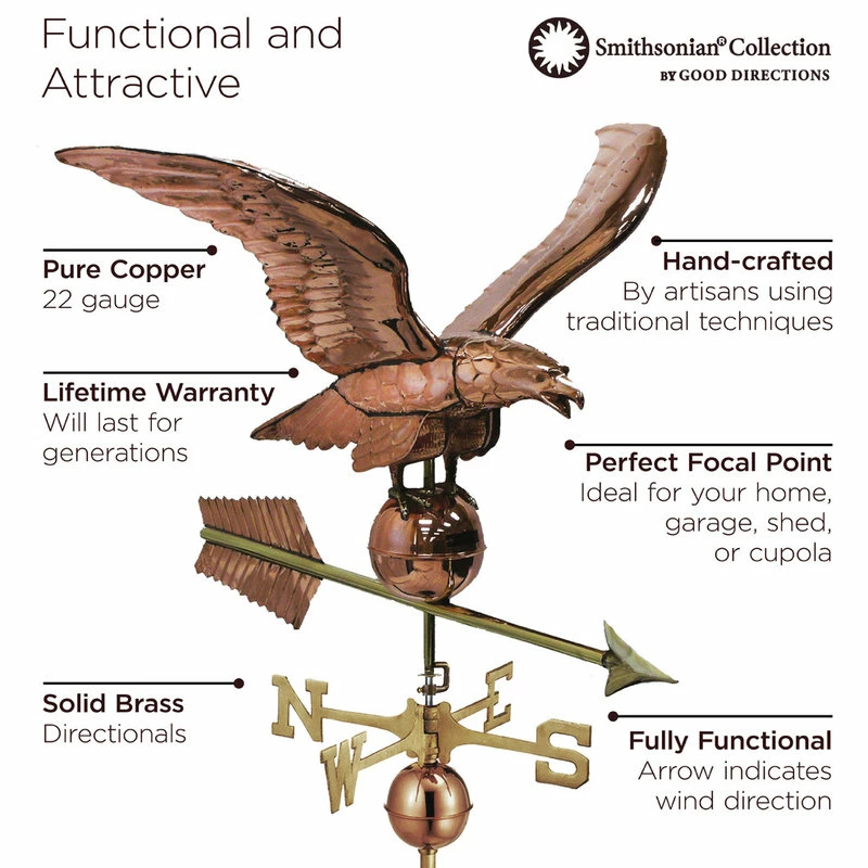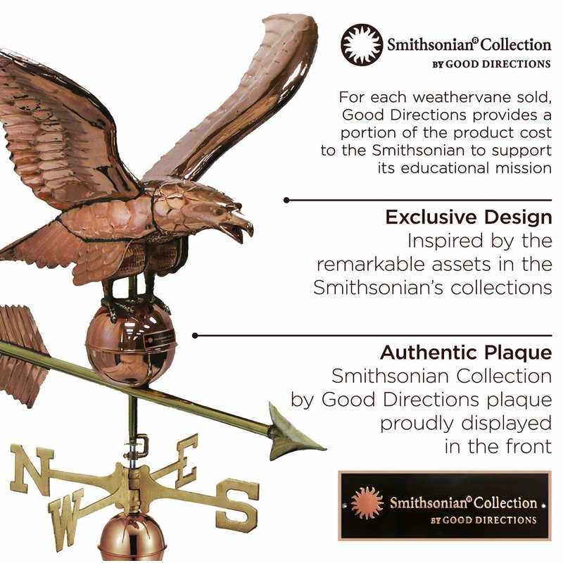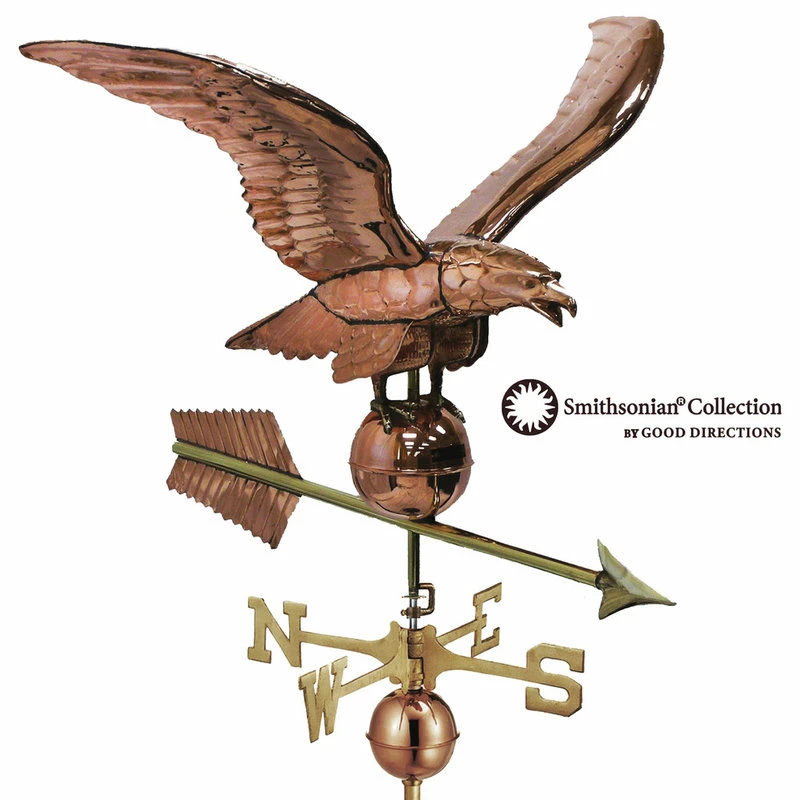 Exquisite heritage design from our prestigious Smithsonian Collection; handcrafted by Good Directions artisans. The official symbol of our great nation, this majestic eagle spreads its broad wings to adorn the rooftop of your larger home, garage, cupola or barn. For over 35 years Good Directions pure copper weathervanes have been unsurpassed in style, quality, and durability perfect for the house-proud homeowner. Weathervanes are easy-to-assemble and install. Includes an assembly rod, solid brass 23″L directionals, and copper globes. A 401LG Roof Mount is recommended to mount your weathervane to your rooftop, sold separately. The assembled size of this weathervane is 41 L x 50″H x 34″Wingspan. The figure-only size is 41″L x 32″H x 34″Wingspan. The Pure Copper will age naturally over time. Our exclusive Single Point Contact design allows our weathervanes to spin easily in the wind. Bring The Joy of Outdoor Living to your home with this heirloom-quality piece.