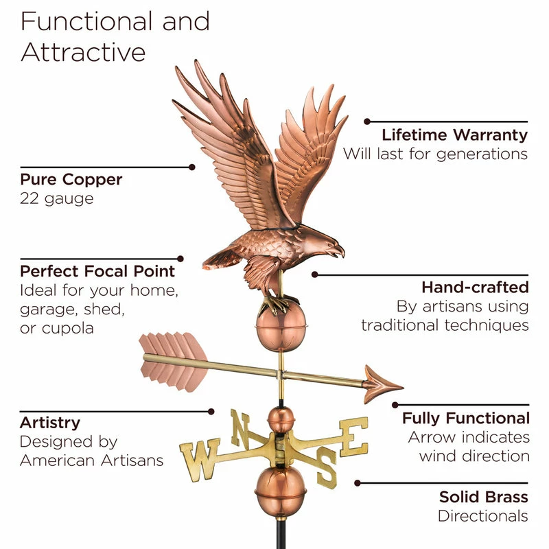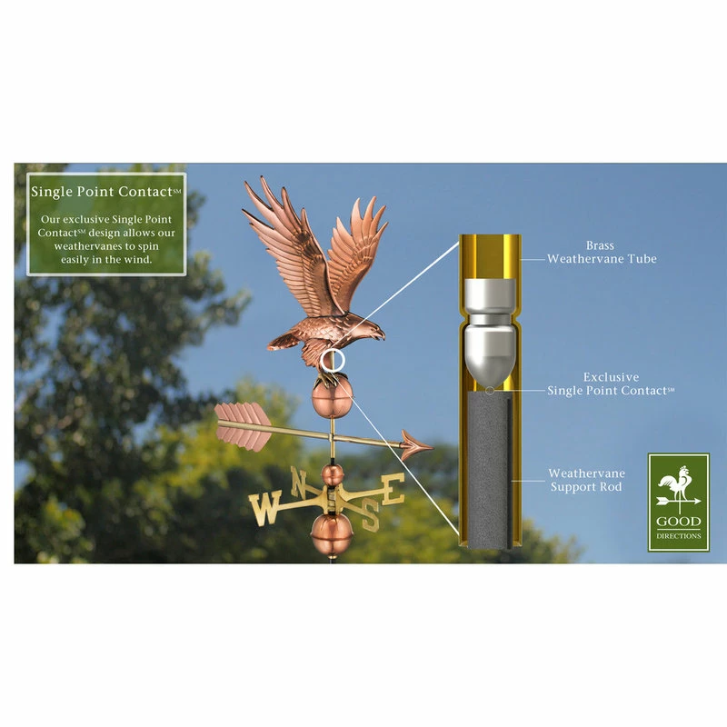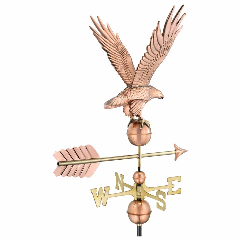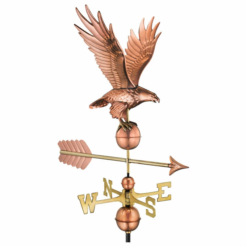 Eagles are admired the world over as living symbols of power and freedom. Now our Freedom Eagle can adorn the rooftop of your home, garage, cupola or barn. For over 35 years Good Directions pure copper weathervanes have been unsurpassed in style, quality, and durability perfect for the house-proud homeowner. Weathervanes are easy-to-assemble and install. Includes an assembly rod, solid brass 18″L directionals, and copper globes. A 401AL Roof Mount is recommended to mount your weathervane to your rooftop, sold separately. The assembled size of this weathervane is 26 L x 41″H x 21″ Wingspan. The figure-only size is 26″L x 23″H x 21″ Wingspan. The Pure Copper will age naturally over time. Our exclusive Single Point Contact design allows our weathervanes to spin easily in the wind. Bring The Joy of Outdoor Living to your home with this heirloom-quality piece.