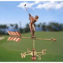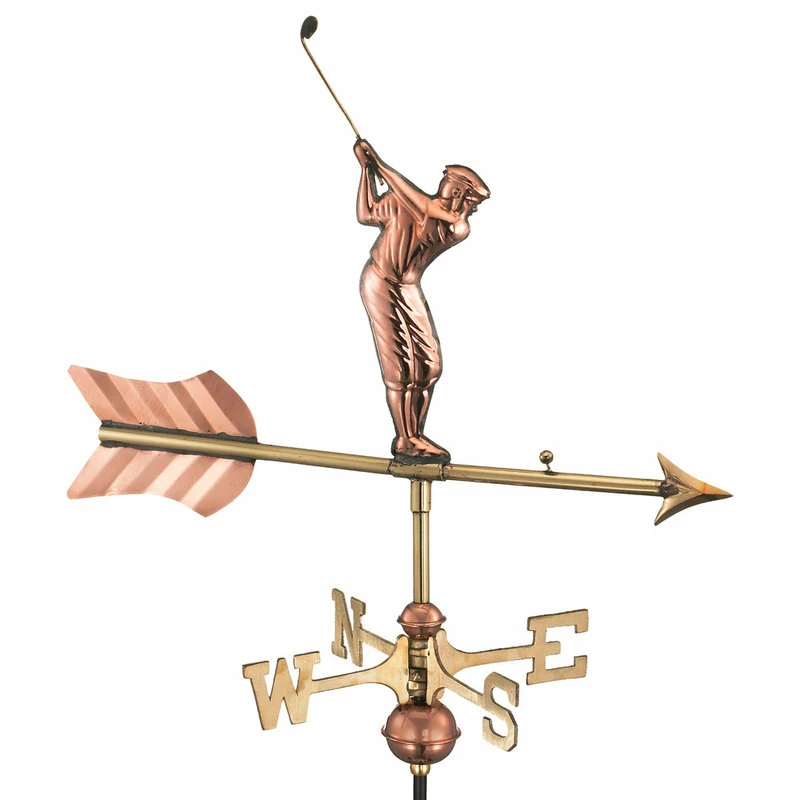 The addictive sport may have originated in Scotland, but this golfer is ready to adorn your garden, deck or yard. For over 35 years Good Directions pure copper weathervanes have been unsurpassed in style, quality, and durability perfect for the house-proud homeowner. Weathervanes are easy-to-assemble and install. Includes an assembly rod, solid brass 11″L directionals, copper globes, and 53″ garden pole. The assembled size of this weathervane is 21 L x 28″H x 11″W. The figure-only size is 21″L x 13″H. The Pure Copper will age naturally over time. Bring The Joy of Outdoor Living to your home with this heirloom-quality piece.