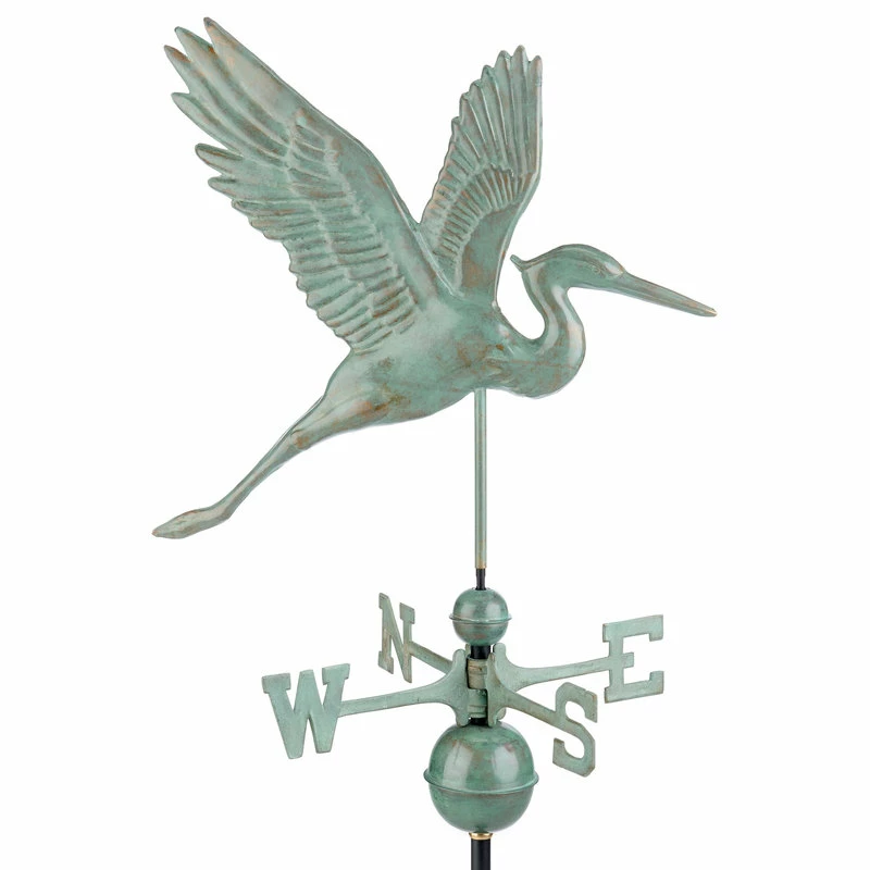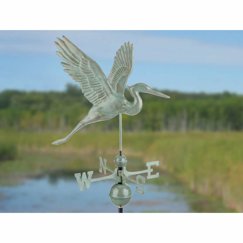 Heading away from his marsh nest, this Graceful Blue Heron is ready to perch atop the rooftop of your home, garage, cupola, barn or gazebo. For over 35 years Good Directions pure copper weathervanes have been unsurpassed in style, quality, and durability perfect for the house-proud homeowner. Weathervanes are easy-to-assemble and install. Includes an assembly rod, solid brass 18″L directionals, and copper globes. A 401AL Roof Mount is recommended to mount your weathervane to your rooftop, sold separately. The assembled size of this weathervane is 21 L x 36″H x 18″W. The figure-only size is 21″L x 18″H x 2″W. The beautiful Blue Verde finish achieves the historic look of aged copper. Our exclusive Single Point Contact design allows our weathervanes to spin easily in the wind. Bring The Joy of Outdoor Living to your home with this heirloom-quality piece.