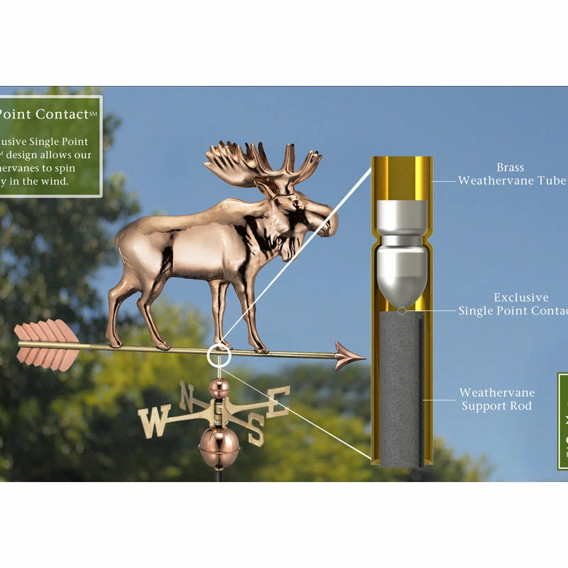 The quest of Thoreau’s Indian guides, the moose is the largest member of the deer family. Now he’s ready to adorn the rooftop of your home, garage, cupola, barn or gazebo. For over 35 years Good Directions pure copper weathervanes have been unsurpassed in style, quality, and durability perfect for the house-proud homeowner. Weathervanes are easy-to-assemble and install. Includes an assembly rod, solid brass 18″L directionals, and copper globes. A 401AL Roof Mount is recommended to mount your weathervane to your rooftop, sold separately. The assembled size of this weathervane is 37 L x 40″H x 18″W. The figure-only size is 37″L x 22″H x 3″W. The Pure Copper will age naturally over time. Our exclusive Single Point Contact design allows our weathervanes to spin easily in the wind. Bring The Joy of Outdoor Living to your home with this heirloom-quality piece.
