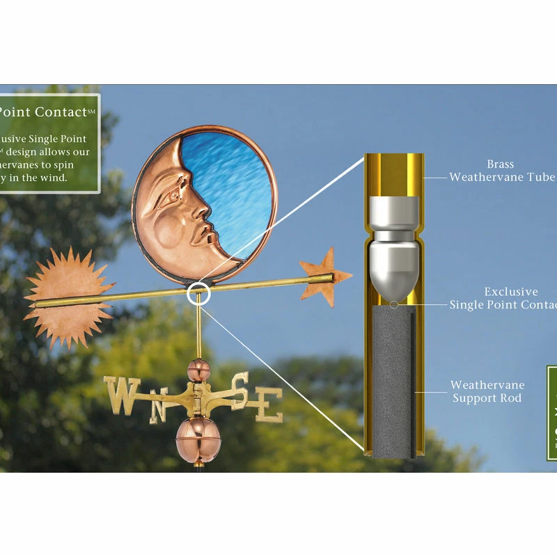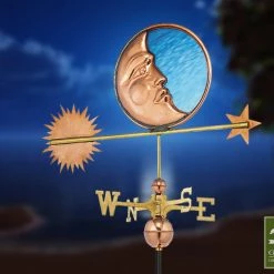 A stunning portrayal of the sun, moon, and stars, this stained glass weathervane is ready to adorn the rooftop of your home, garage, cupola, barn or gazebo. For over 35 years Good Directions pure copper weathervanes have been unsurpassed in style, quality, and durability perfect for the house-proud homeowner. Weathervanes are easy-to-assemble and install. Includes an assembly rod, solid brass 18″L directionals, and copper globes. A 401AL Roof Mount is recommended to mount your weathervane to your rooftop, sold separately. The assembled size of this weathervane is 33 L x 39″H x 18″W. The figure-only size is 33″L x 21″H x 2″W. The Pure Copper will age naturally over time. Our exclusive Single Point Contact design allows our weathervanes to spin easily in the wind. Bring The Joy of Outdoor Living to your home with this heirloom-quality piece.