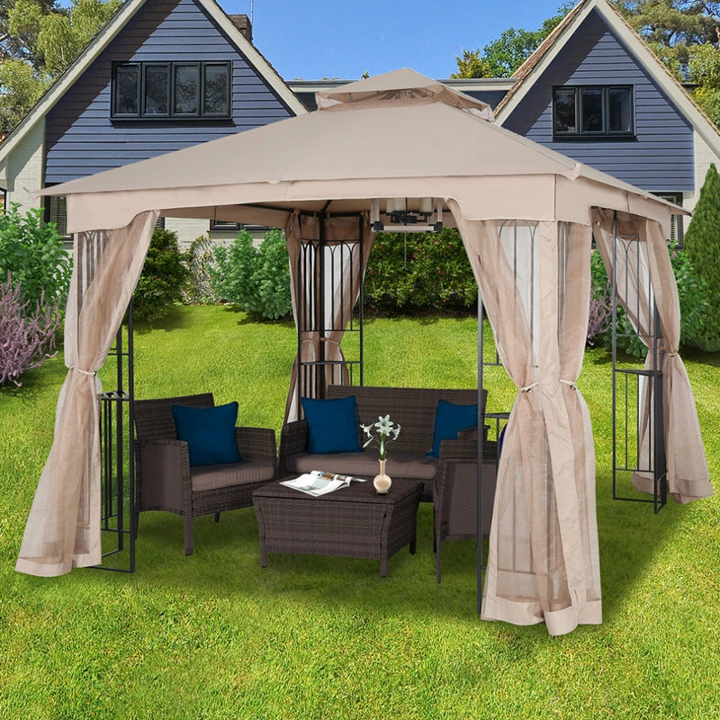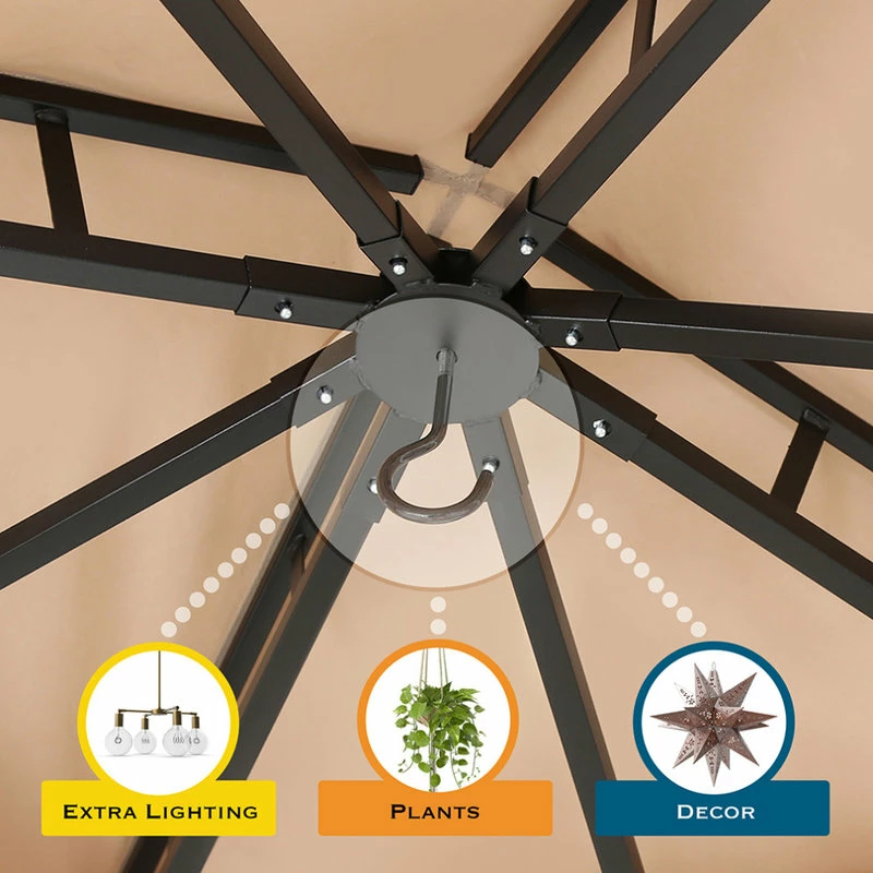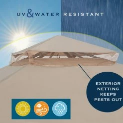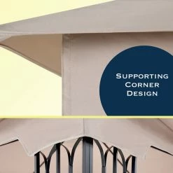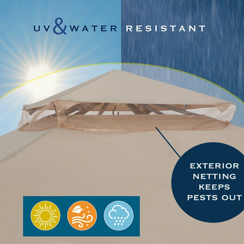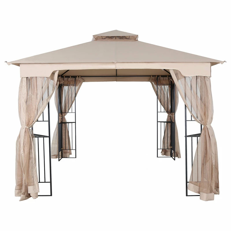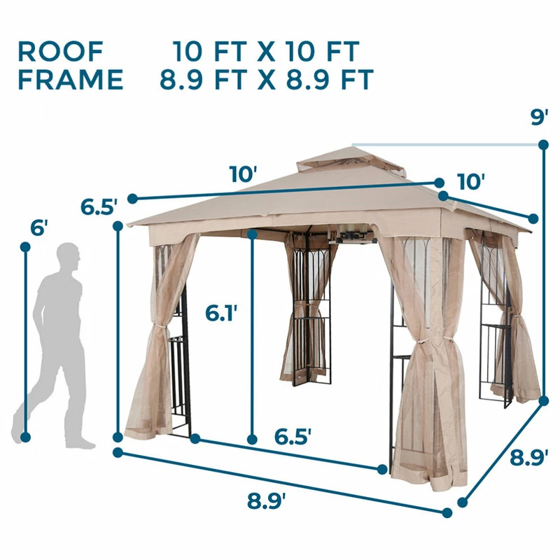 Create your own private oasis and relax yourself beneath the shade of this classic gazebo with a vented double-tier roof, zippered mosquito netting on all sides and convenient shelves in each corner of the column-style frame. This LAUREL CANYON 10 ft. x 10 ft. Square Khaki Soft Top Steel Outdoor Patio Gazebo is constructed with a heavy-duty steel frame that protects you from sun and rain. The steel frame is powder coated in a black color that helps prevent rust, corrosion, chipping and peeling. The Khaki Roof also has decorative fabric trim around the roofline to enhance the look of your outdoor patio area. The 4 mosquito mesh netting curtains have zippers so that you can keep bugs out. The ceiling hook is convenient for you to hang a light, fan, plant, etc. for this screened in gazebo 10 ft. x 10 ft. We recommend that the Canopy and Mosquito Net be removed during heavy rains and stormy conditions. Assembly is required.