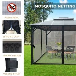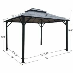 Create your own private oasis and relax yourself beneath the shade of this classic gazebo with an insulated double roof. This gazebo is constructed with a heavy-duty steel frame and aluminum composite roof panel that protects you from sun, rain and snow. The aluminum composite roof panels have multiple layers that help insulate against heat and sound. The roof and frame have a dark gray finish. Mosquito nets can keep insects and mosquitoes out, providing you with a more cozy ambiance. The ceiling hook is convenient for you to hang light or fan. We recommend that you remove the accumulated snow from the roof. Assembly is required.