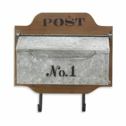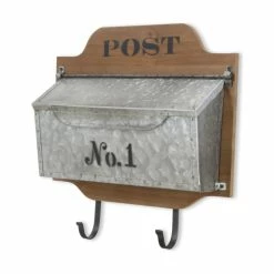 A way to organize your post and add a touch of unique design, this Wall Hanging Letterbox with Metal Hooks is made from a mix of wood and metal. The wooden background has a light brown varnish on it with the words ‘Post’ written on the top curved edge, On top of this background there is a metal letterbox in a hammered silver finish which has ‘No. 1’ written on it. Underneath this piece there are two black metal hooks that allow you to hang your coats or hats as you walk in the door. 14″ H x 13.5″ W x 3.75″ D