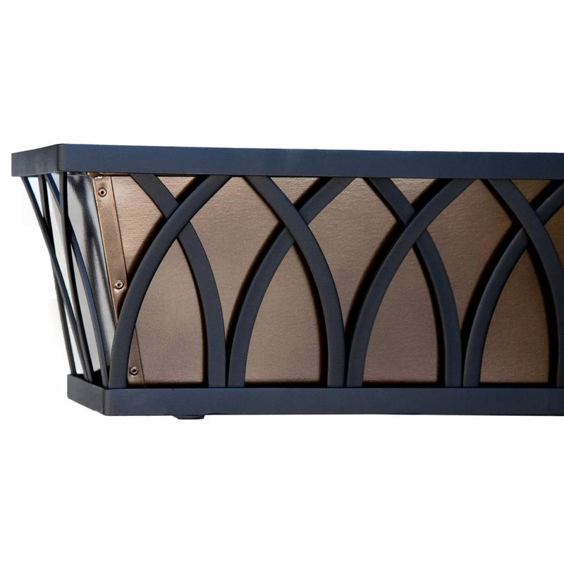 Revitalize outdoor walls, windows and deck railings with the luxurious look of an Arch Decora Wrought Iron and Bronze Window Box. This flower cage and liner combination has pleasing shape, color and texture. A gently tapering silhouette gives the planter interesting dimension, and the inlaid russet tone provides the perfect backdrop to arching black bars. Both the wrought iron cage and galvanized metal liner are powder coated to achieve attractive color in addition to rust resistance. And bronze-tone inserts are easy to move as needed for indoor planting early in the season or winter storage.