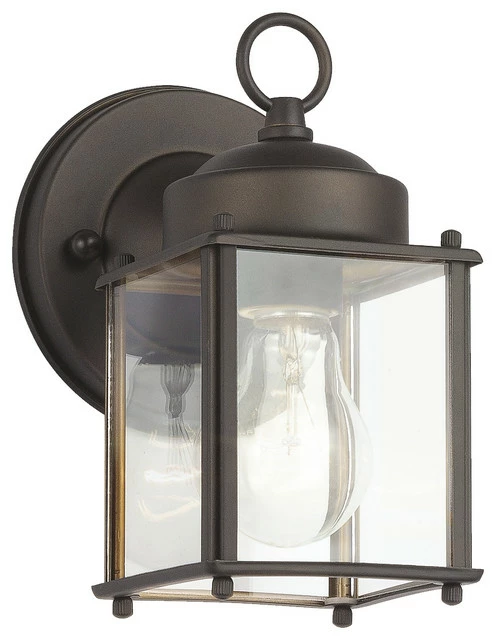 The one light New Street wall lantern features a classic profile, solid brass construction with Olde Bronze finish, and clear glass panels.