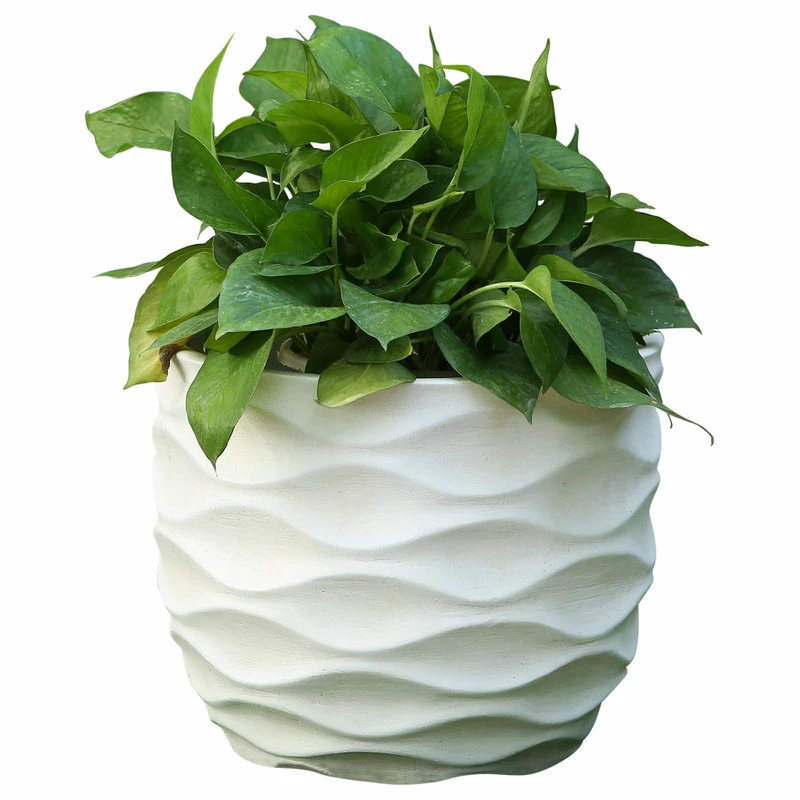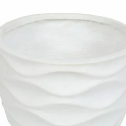 This wavy, white finish, round pot planter is made of durable MgO fiberclay, and is suitable for year round use outdoors in your garden, patio, or porch. With its beautifully white finish, the round planter will make a warm ambiance to your indoors as well. The round planter is 15.4in. H making it ideal for your medium and larger sized foliage and plants.The planter includes a drainage hole.