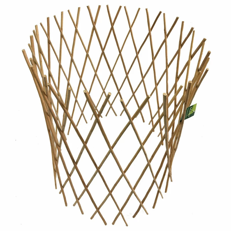 Our carbonized barkless willow circular flex fence panel can be used as a screen or to protect your yard area. It forms a circle up to 60″ in diameter when the fence is stretched to 30″ high. Each one of these versatile, lightweight, circular fences stretches from 1 to 4 in height depending on how long it would expand (the fence becomes shorter as its stretched longer). Willow sticks are light mahogany color, they are smooth and skinless, carbonized to resist outdoor elements, and aged to a grey color. Use them for protecting your favorite flowers and plants and the diamond pattern lattice will enhance the look your garden.