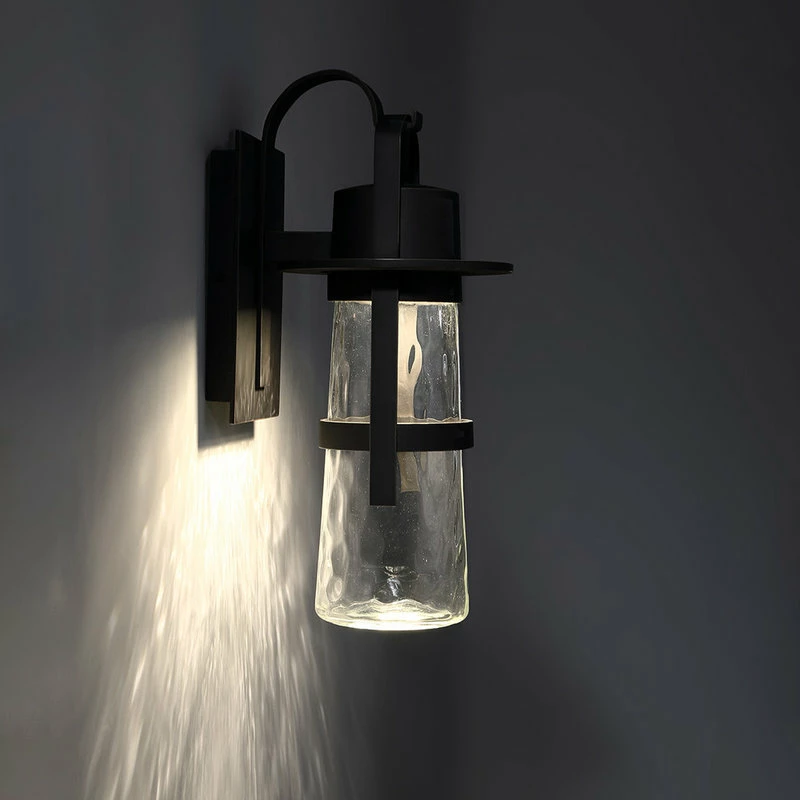 - Aluminum construction with a thick mouth blown hammered clear glass element.