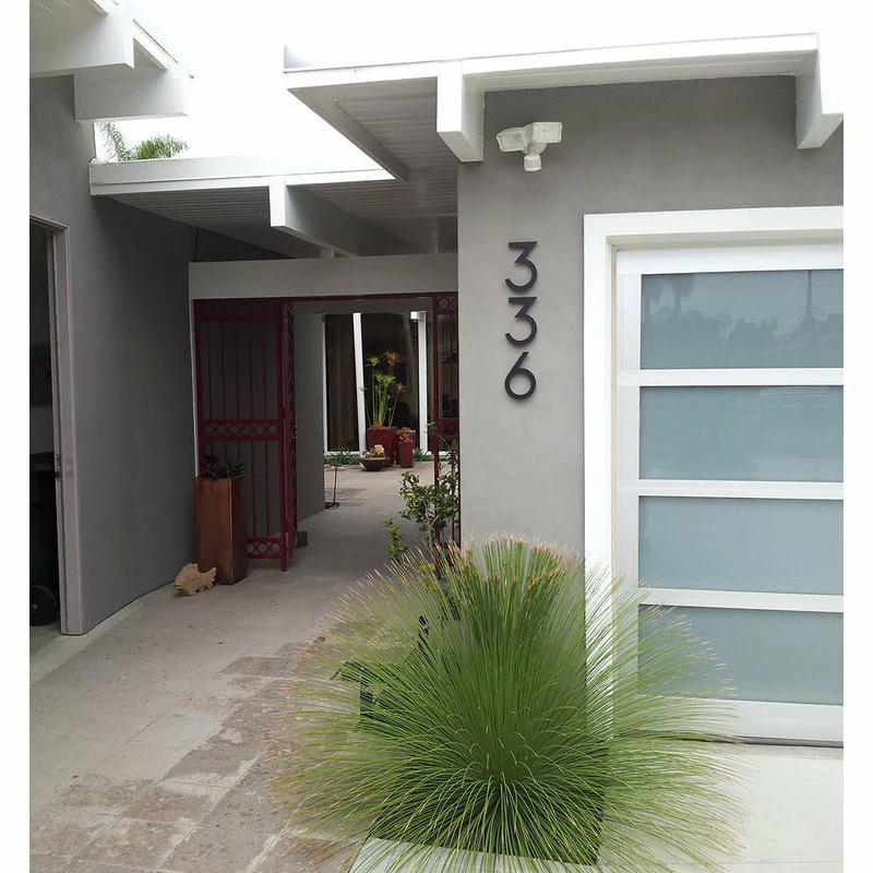Each modern house number comes with a brushed finish and clear protective coating that will help withstand extreme weather conditions. Numbers are cut using our own waterjet cutter. Installation hardware, mounting template, & instructions included.