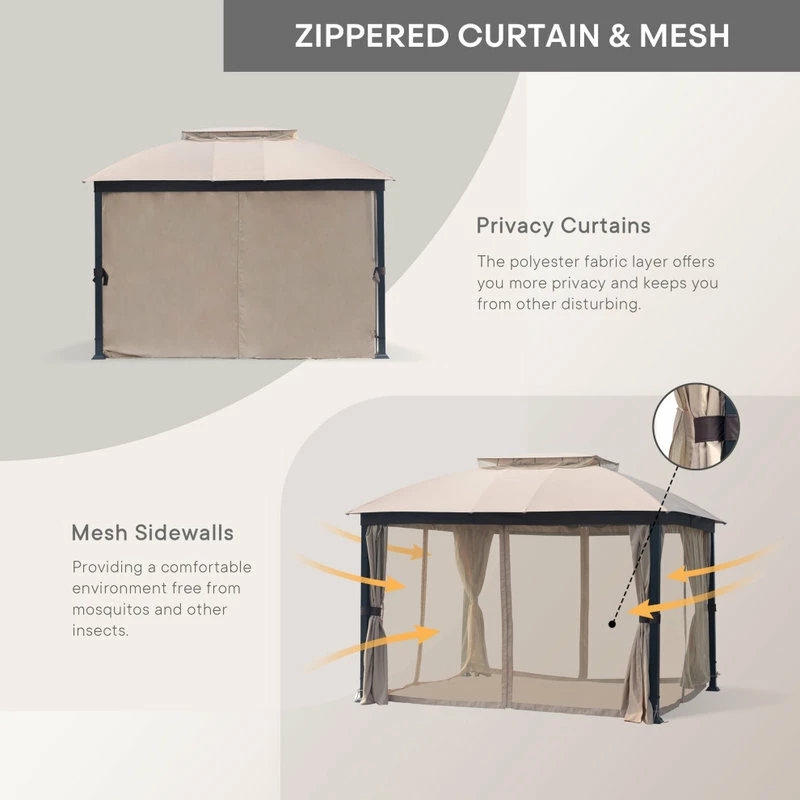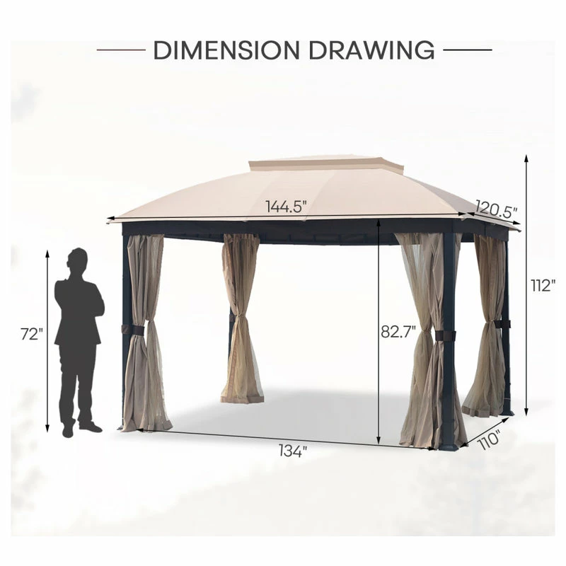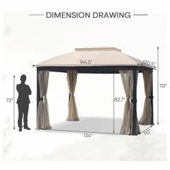 Expand your living space by moving the indoors outside to create an end-of-the-day oasis perfect for entertaining family and friends. This 144″ x 120″ gazebo creates the extra outdoor living experience you’ve been after. Enjoy covered relaxation outside under the rust-resistant powder-coated steel frame with weather-resistant fabric. With straight-forward, easy-to-follow assembly instructions you’ll be relaxing with your choice of any beverage in your new outdoor living space for years to come. It’s the perfect shade addition to any outdoor space and can easily be combined with any outdoor dining tables and dining chairs for maximum shade. It can also be used with sectionals, daybeds, and recliners at hotels, restaurants, and poolside spaces. It’s the perfect piece for relaxing, entertaining and enjoying the outdoors.