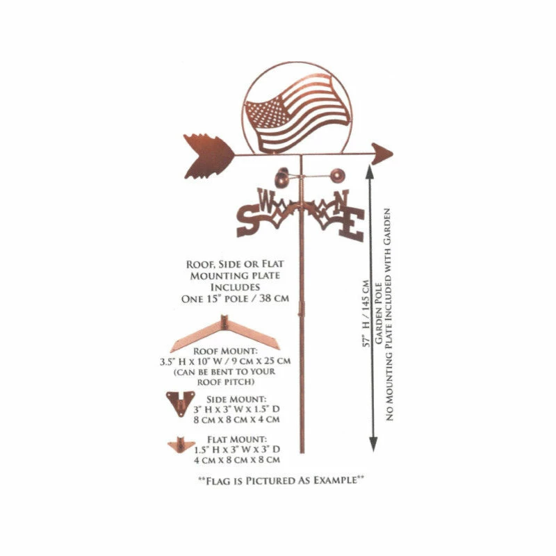 Our weathervanes are constructed from 16 gauge steel and then powder coated copper for many years use. The top of the weathervane pivots on a strong stainless steel pin,. The windcups have a sealed ball bearing that will spin with the slightest breeze. The garden mounting pole is 2 pieces that screw into each other.
