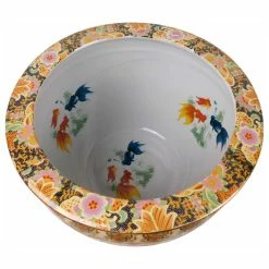 Available in six sizes, this 10″ porcelain fish bowl planter from China has a traditional Japanese Satsuma style pattern. Two panels are painted with geisha’s in kimonos while butterflies and flowers are on the other two panels. Rich metallic gold is glazed in floral accents so thick that it’s textured. The color pallet is wide and the contrasting tones make a great visual. We provide hard to find large floor sizes or use smaller sizes for table top decor. Add an elegant design statement to your planter with one of our vase stands available in a wide assortment of styles and wood types. Remember to use the bottom diameter size when selecting your stand.