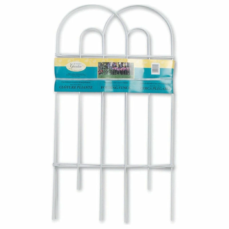 Panaceaâ„¢ Arch Folding Fence adds a stylish look to your garden path or around landscaping. Line your garden path or protect your landscaping from foot traffic using this arch folding fence. Folds and unfolds easily as well as installing with ease. A double arch effect lends an architectural hint to this accent, while the white color brings a lively look. Each arched section has two horizontal arms supporting the unit, and a hook at the end of each arm connects to another arched section. This aids the fence in folding and unfolding, and allows versatility in shaping and placement of the item. This barrier installs easily into the ground, and the metal construction and white powder coated finish offer weather resistance for several seasons.