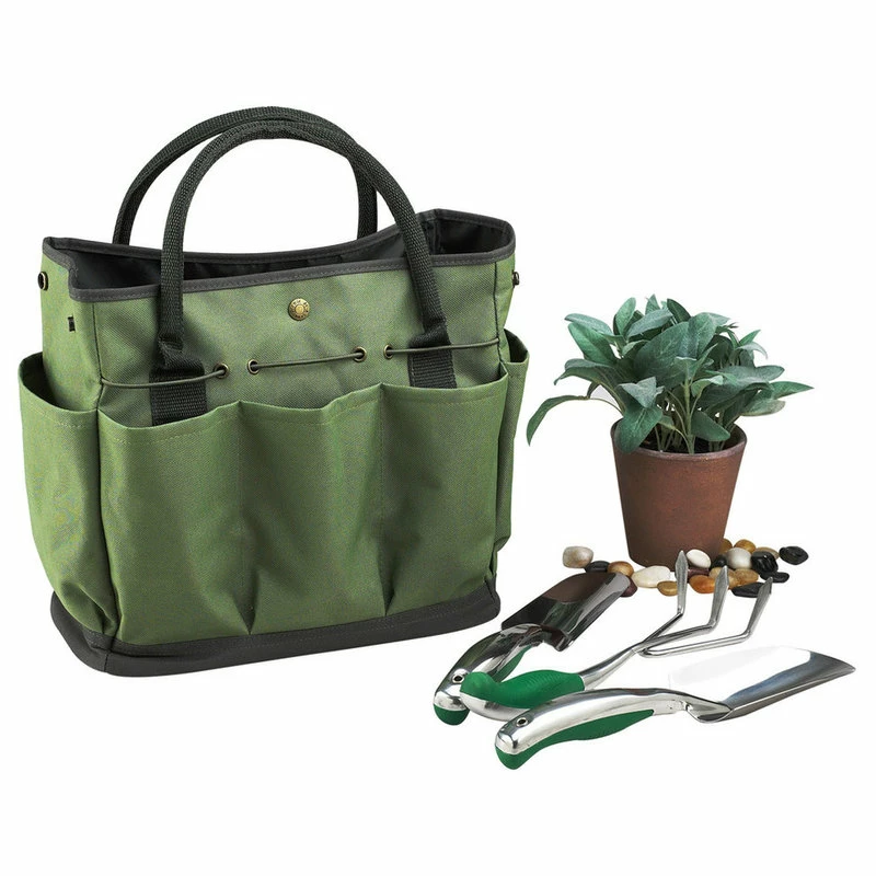Casual Style defines this durable multi-pocket gardening tote. Set includes three top quality, heavy gauge stainless tools with comfort grip handles. Roomy interior is great for transporting supplies & side pockets have room for a beverage and snack. Designed and Assembled in the USA. Lifetime Warranty.