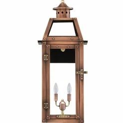 This 20 inch solid copper lantern features narrow and tall vertical lines with top and bottom tempered glass and powder painted aluminum bracket. Electric version has two 60 watt candelabra. ETL Certified.
