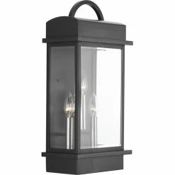 A classic colonial wall lantern with contemporary touches describes Santee. Featuring a geometric frame and graphic handle, the wider beveled glass offers more refraction – and visual interest – than typical lantern designs. Choose from a Black frame with stainless steel candle option or an Antique Bronze frame with painted brass candle option.
