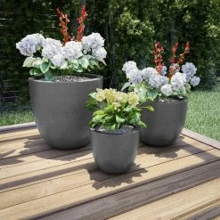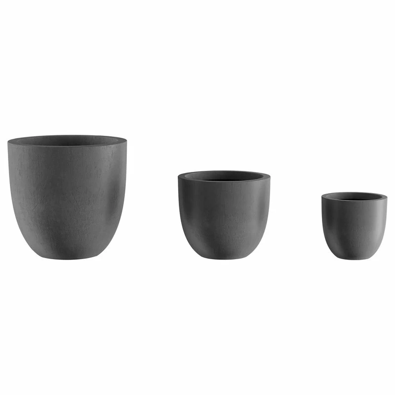 PRODUCT DETAILS- Materials: Fiber Clay. Small Pot Dimensions: 9.75″ Diameter x 9.25″ H. Medium Pot Dimensions: 13.75″ Diameter x 12″ H. Large Pot Dimensions: 17.75″ Diameter x 17.25″ H. Combined Weight: 27 Pounds. Color: Gray.
