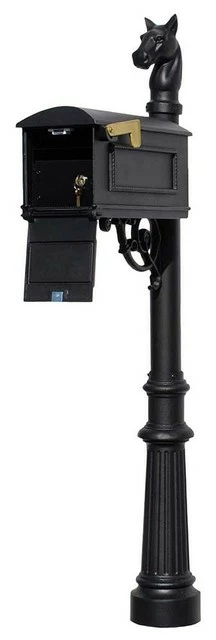 Our Lewiston Equine Decorative Post Mount Mailbox system with locking insert is made of rust-free cast aluminum with a durable powder coated weather resistant finish. System includes a Lewiston Mailbox, locking insert, post, mounting support bracket, horsehead finial and fluted base.