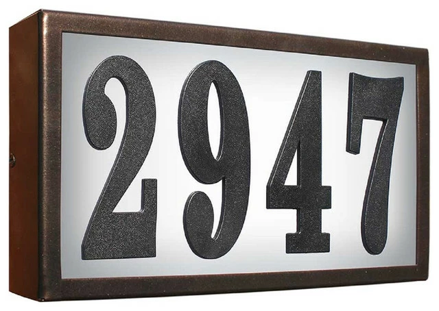 - Includes: 2 sets of numbers 4″ blacl polymer (cast aluminum & vinyl numbers), adhesive glue, LED bulbs, and wiring.