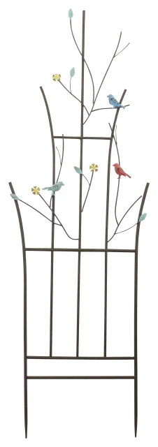 Curved frame makes this trellis unique with painted metal bird icons. Metal. Made in China.