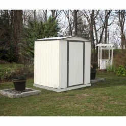 Introducing the EZEE Shed from Arrow Storage Products – a shed that builds in half the time. The EZEE Shed is a galvanized steel shed that is durable and made to last. It Features: the revolutionary Snap-IT Quick Assembly system that cuts assembly time down by 50% compared to most steel sheds on the market today. The EZEE Shed has a reduced number of fasteners across walls, roof, and doors and there are no more difficult nut/bolt connections – so assembly is faster and easier. The EZEE Shed Features: a design that is 2x stronger than leading steel sheds on the market. Its unique panel geometry is more impact resistant, and with its overlapping Snap-IT panels that connect every 12 inches, it boasts a stronger overall building design. The EZEE Shed also Features: improved roof assembly that allows for ground assembly of the roof for easier and faster roof attachment. The EZEE Shed is not only a tougher shed with faster assembly, it’s a more modern and attractive take on outdoor storage sheds, too. The EZEE Shed is available in an updated color pallet that makes it a modern and stylish storage solution for backyard, patio, and garden areas. The EZEE Shed doesn’t just look better; it offers better storage space, as well. The EZEE Shed’s attractive swing door design allows for easier access to your items and Features: a heavy duty framed out design. The doors are set on 3 hinges for extra durability. The EZEE Shed is a strong and modern alternative to your standard backyard shed, and the next step up in steel shed assembly and design. Gable vents allow for better air circulation and temperature regulation within your steel shed unitStore up: 72 in. wall heights for higher storage space. Item Includes: frame, panels, door, hardware, handle