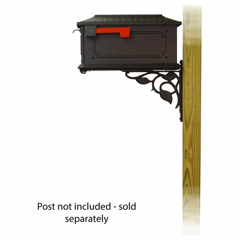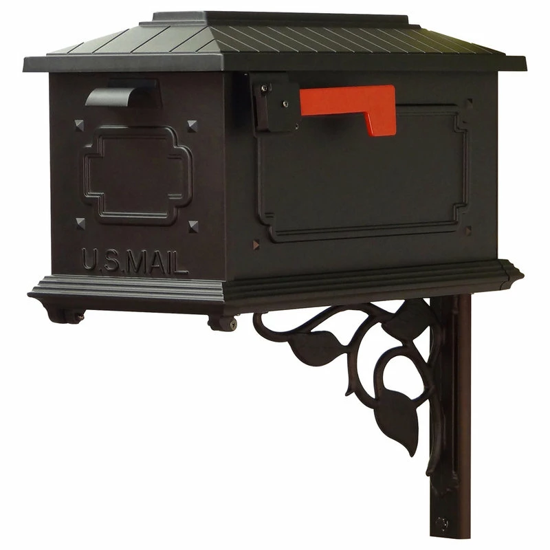The Kingston Mailbox and Floral mounting bracket combination presents a upscale alternative for the typical wood post curbside mailbox. The Kingston Curbside Mailbox will add a unique look to your curb appeal. The solid cast aluminum construction and geometric styling makes this mailbox the perfect choice for modern or contemporary architecture. No mounting plate is required. The Floral mounting bracket is a decorative cast aluminum bracket that will bring an elegant appearance to your mailbox. Mailbox and mailbox mounting bracket included. This set does NOT include a post as it is intended to be mounted on an existing wood post or solid surface, or a new wood post that can be purchased separately. Mounting hardware is included.