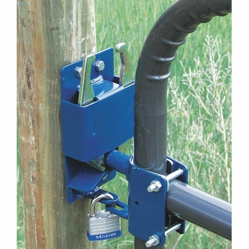 Designed to accept padlock. 1-hand operation. Swings in either direction. Round tube gates 1-5/8″ to 2″ O.D. Painted blue.