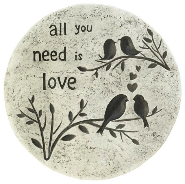 This flock of birds is ready to impart timeless wisdom to your garden or outdoor space. This lovely cement stepping stone features four little birdies on branches and the phase, “All you need is love”. Weight 3.2 pounds Dimensions 9.75″ x 9.75″ x 0.75″