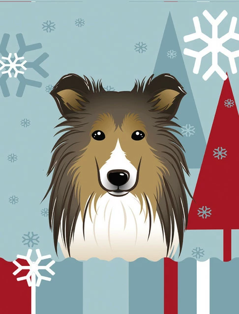 Winter Holiday Sheltie Flag Garden Size. This Garden Flag features artwork of a Sheltie/Shetland Sheepdog. A great gift for a Sheltie/Shetland Sheepdog owner. If Winter is one of your favorite seasons. Then you can certainly use this Garden Flag to add to your decorations for the Winter season. Full color double ply fabric decorative sleeve pole Garden Flag. This Garden size flag is made from a 100% polyester material. Two pieces of material have been sewn together to form a double sided flag. This allows the text and image to be seen the same from both sides and to read correctly. This flag is fade resistant and weather proof. These flags are only sold online and in specialty boutiques. The flag measures approximately 11 inches x 15 1/2 inches. The flag has a 1 1/2 inch sleeve sewn in to allow you to attach the flag to any standard garden flag stand or garden size porch hanger. (The garden stand is sold separately)