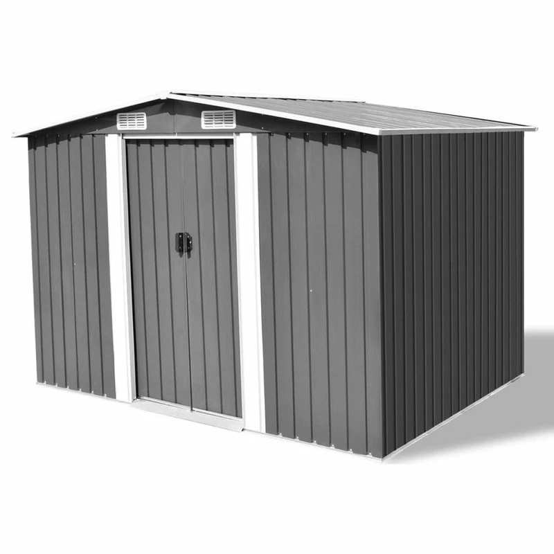 This metal storage shed will be perfect for storing a wide variety of tools and equipment. This storage shed has 4 vents, 2 in the front and 2 in the rear, ensuring excellent ventilation. The double sliding doors in the front allow easy entry and exit. The galvanized steel construction makes it durable and strong, so it won’t corrode or be otherwise affected by extreme weather. It also includes a steel floor frame which adds stability and is perfect for a wood floor finish (wood not included). The pre-cut, pre-drilled parts and the included instruction manual ensure fast and easy assembly.