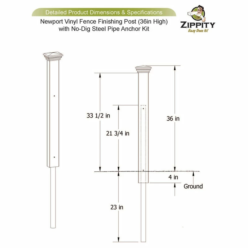 This no-dig finishing post is designed to be used with the Newport Gate (ZP19004) or to terminate your fence run when installing the Newport Vinyl Fence (ZP19002). To install your fence posts, use a sledge hammer to drive the steel pipe into the ground and sleeve your vinyl post over top. Please note that this fence is designed to be permanent and is not easily removed once installed.