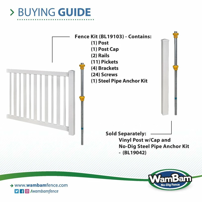 The best part of is this fence is ease of installation. This innovative installation method doesn’t require digging deep holes or pouring concrete, so it takes a lot of the time and labor out of installing your fence. You install the yard and pool fence post much like chain link has been installed for the past 50 years- by first driving a steel 1-5/8in galvanized pipe anchor (included) deep into the ground with a sledge hammer or post pounder. If your pipe is slightly crooked after installation, you can utilize our patented levelling donuts (included), to adjust into level to compensate accordingly. Once you sleeve your vinyl post over the pipe, it’s straight and level. The end result is a sturdy and strong permanent fence that will last decades. For more detail, see our installation guides.