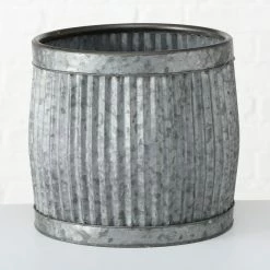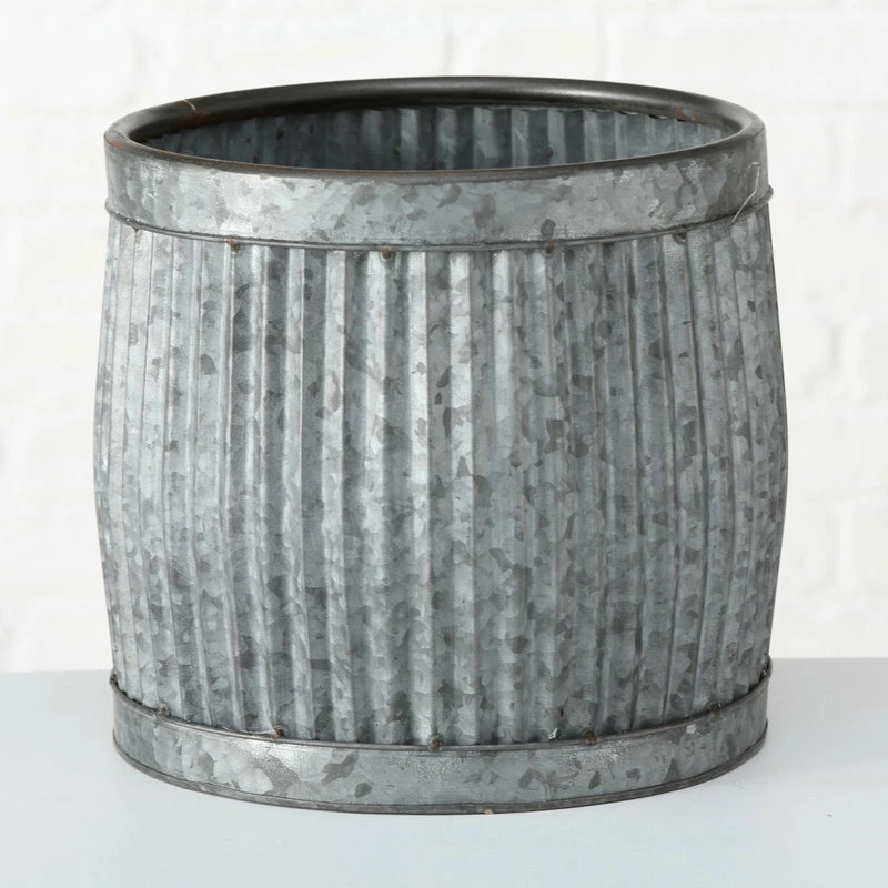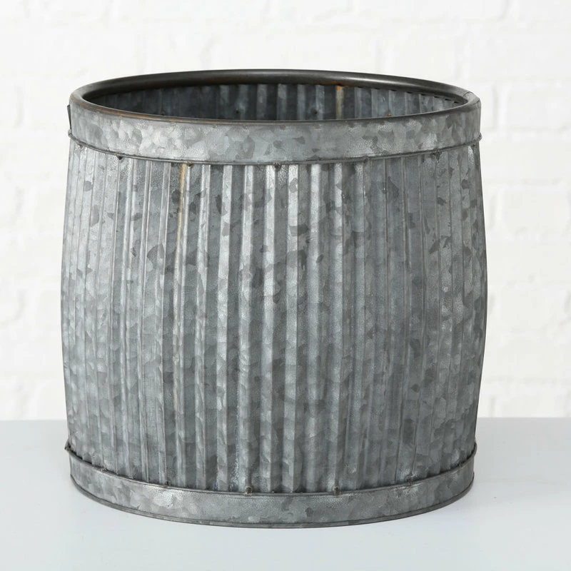 Galvanized metal planters. Expand your gardening space with these metal planters inspired by those found in French country gardens. This eye-catching set of 3 is perfect for growing pots of herbs, vegetables, and container plants. Loaded with rustic charm, these metal planters are detailed with vertical corrugated ribs, bands at top and bottom, and rolled rims. Beautifully proportioned, display them next to each other to create a leveled container garden or individually to suit your spaces. These over-sized planters range in size from over 1 Ft in diameter and measure as follows: 1- large 17 D x 15 H, 2 – medium 14 3/4 D x 13 3/4 H, and 3- small 12 D x 12 H inches. Delightful for lots of uses beyond holding plants, these basins score extra points for being a great multi-taskers. They are perfect as catch-all in the house to organize and keep things all together in one place, to being outdoors to hold icy cold drinks during warm weather entertaining. When not in use, nest them inside each other for space efficient storage.